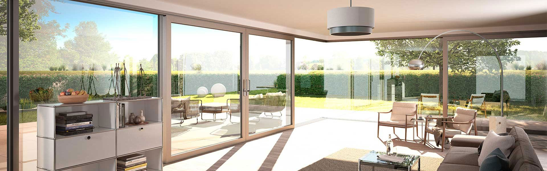 Je nach baulicher Situation stehen verschiedene Varianten zur Auswahl – von klassischen Fenstertüren über Schiebetüren bis zu großzügigen Hebe-Schiebetüren mit Ganzglasecke oder Flügelecke zum Öffnen. Farben, Oberflächen und Griffe können individuell konfiguriert werden.