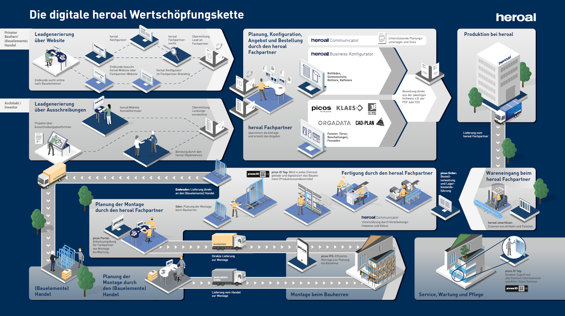 Digitale Lösungen und Services tragen zu einer integrierten Wertschöpfungskette bei und somit maßgeblich zu einer ressourceneffizienten und prozesssicheren Durchführung Ihrer Projekte. heroal bietet Ihnen von der Planung über die Bestellung und Lieferung bis hin zur Fertigung umfangreiche digitale Serviceangebote, mit welchen die richtige Information und Anwendung zur richtigen Zeit am richtigen Ort bereitgestellt werden kann. So profitieren Sie von einer Komplexitätsreduzierung Ihrer Prozesse, einem geringeren Aufwand im Hinblick auf Kommunikation und Informationssuche sowie einer Effizienzsteigerung in der Fertigung. heroal bietet in diesem Kontext unterschiedliche Services wie den heroal Communicator, einen Datamatrix Code auf heroal Profilen sowie digitale Lösungen zur Konfiguration und Bestellung. Außerdem werden die Services durch Angebote aus dem Kooperationsnetzwerk von heroal wie zum Beispiel LogiKal, LogiKal MES und ATHENA erweitert. Die digitalen Services werden kontinuierlich von heroal und seinen Technologiepartnern optimiert und weiterentwickelt, um passgenaue Lösungen für Ihren Prozessbedarf zu ermöglichen.